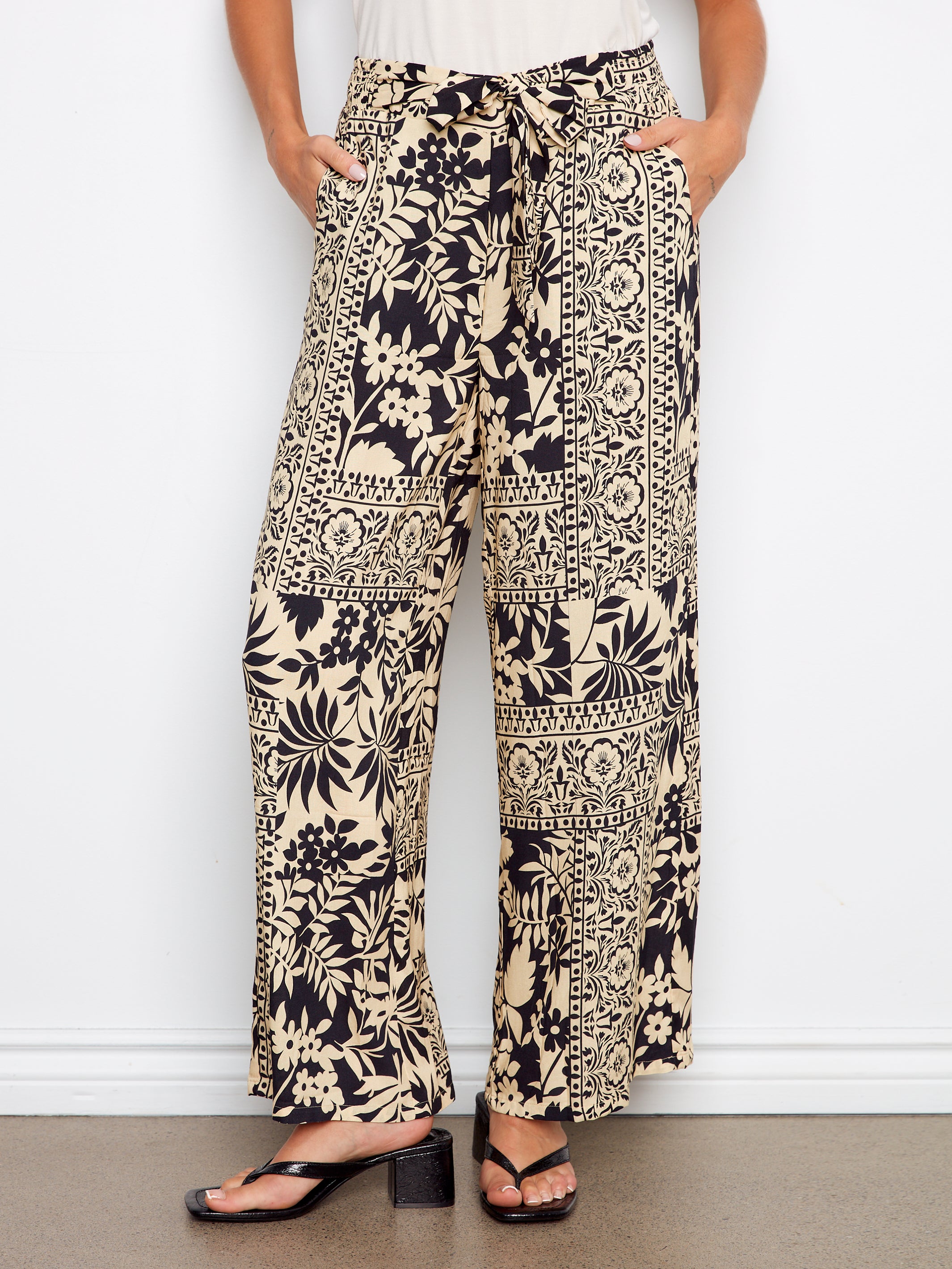 Charlie B Black and Off White Printed Pants With Attacked Belt Ornato