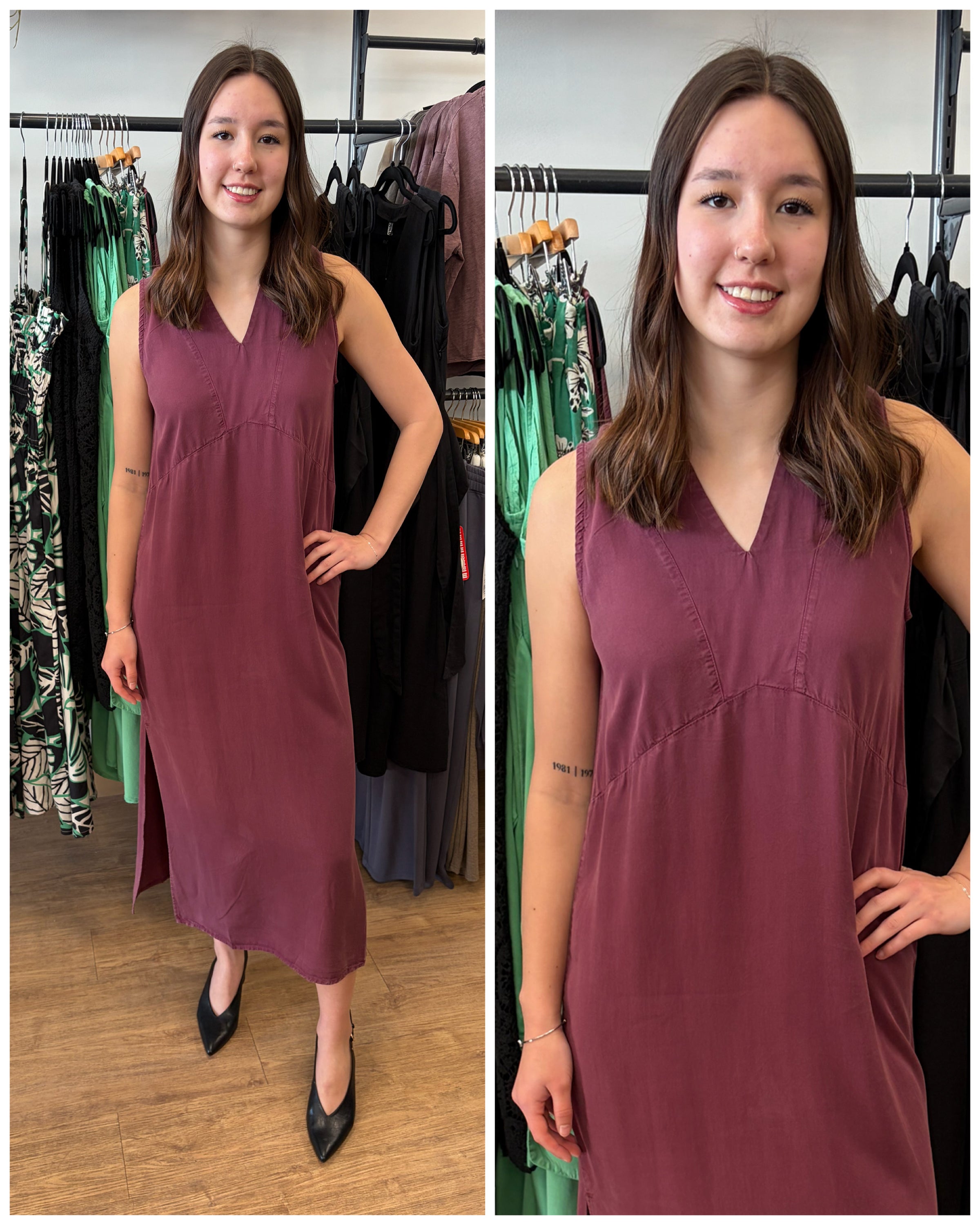 Beautiful mulberry colored maxi dress with two side slits to the knee. We love that it is bra friendly and the fabric is very soft and cooling. Fabric is 100% lyocell.