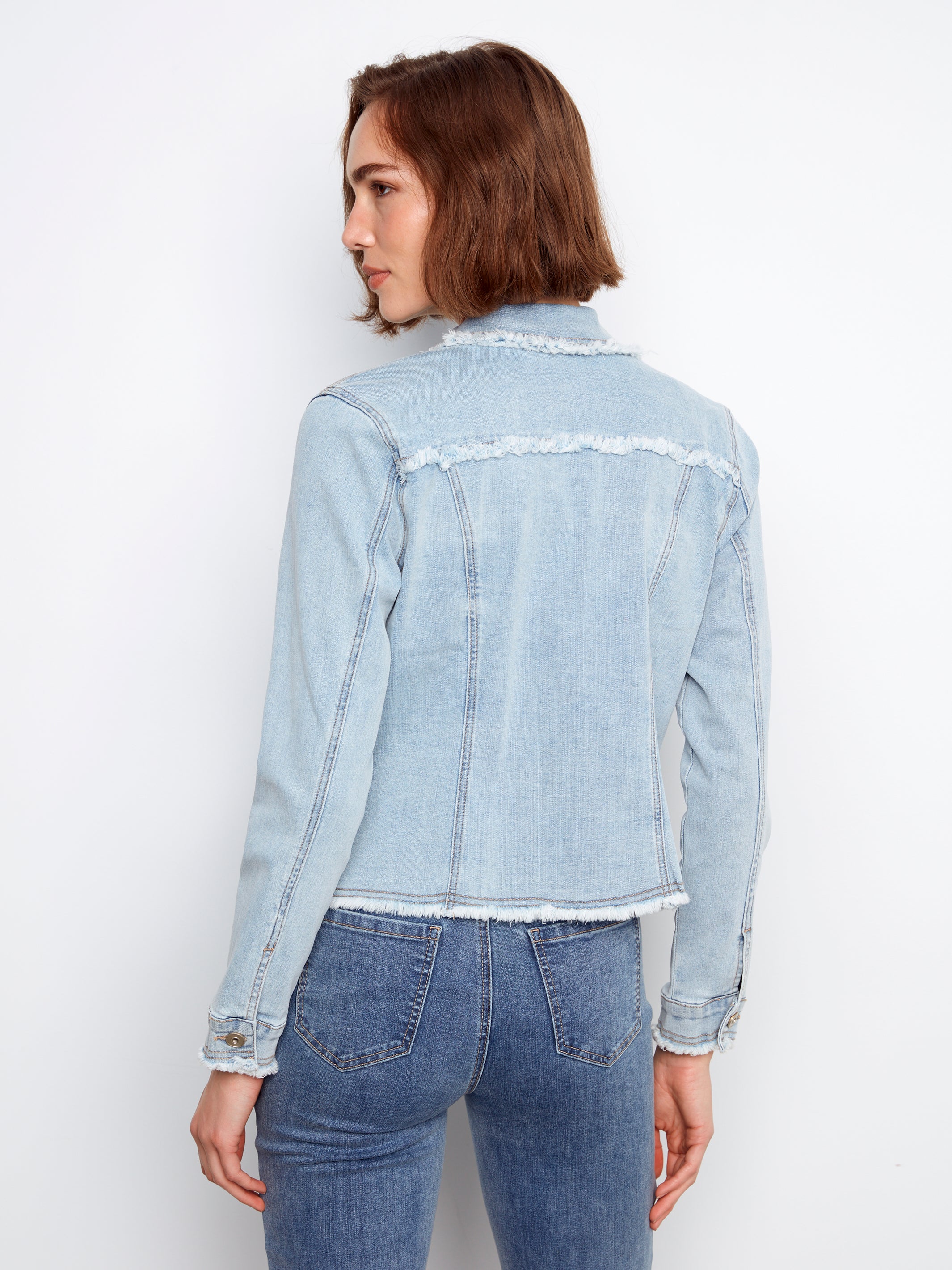Light wash denim jacket with lots of stretch. Love the unfinished hems. Great with a dress. Fabric is 73% cotton, 23% polyester, 3% viscose, 1% spandex.