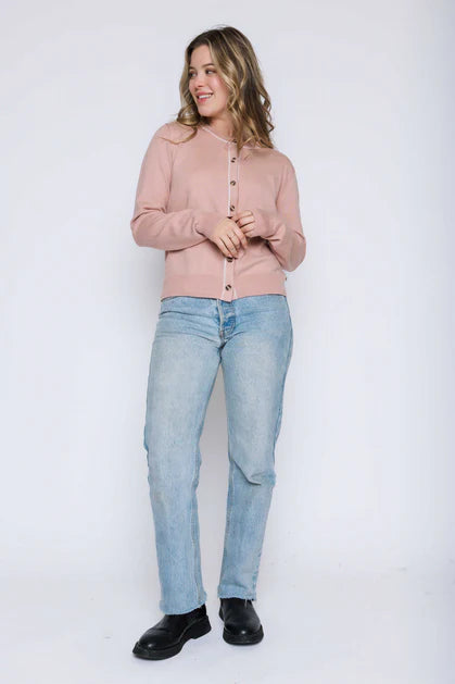 This beautifully soft button front cardigan features faux horn buttons and a pretty contrast tipping detail around the neck and placket. With a round neck and slim-but-not-tight fit.
