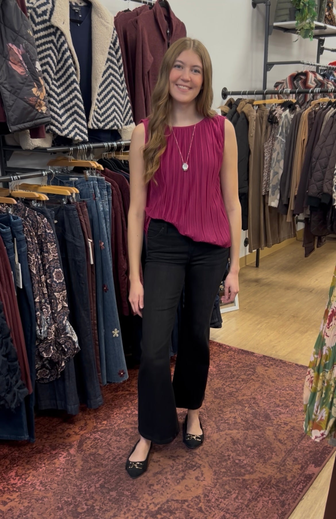 We love this dark black flare jean. So slimming and fun. Inseam measures at 29" on a size 4. Model shown ia 5"10.